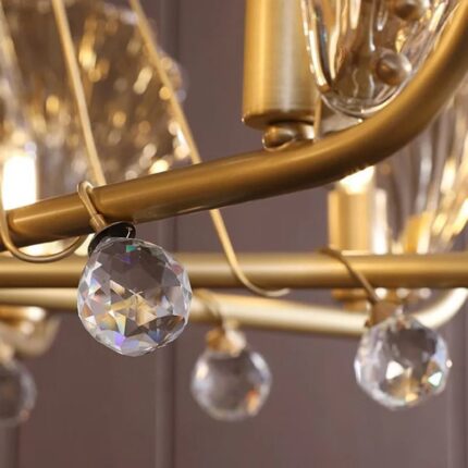 Post-modern luxury chandelier with brass-colored metal body and shell-style glass, 8×4 W warm white LED bulbs. Perfect for living rooms, bedrooms, dining areas, and kitchen tabletops.