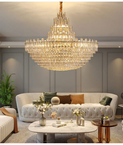 The Modern High-Class Luxury Crystal Chandelier features sparkling K9 crystals with an electroplated gold finish. Available in multiple sizes, it delivers a warm 3000K glow—perfect for elevating living rooms, dining areas, and upscale interiors.