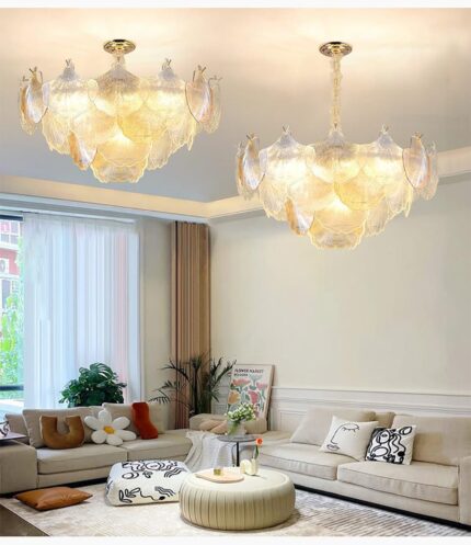 Elegant 800 mm chandelier with metal body and shell-shaped glass, warm 3000K LED bulbs, and adjustable height. Perfect for living rooms, bedrooms, and drawing rooms.