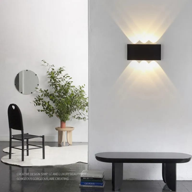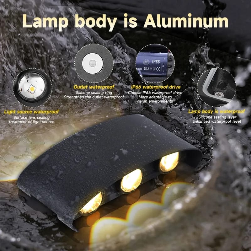 Wall lamp with a sturdy die-cast aluminum body and premium black powder-coated finish. Features a 6W built-in LED with up & down light effect (3000K warm glow), ideal for façades, elevations, boundary walls, and courtyards. Includes complete mounting accessories.