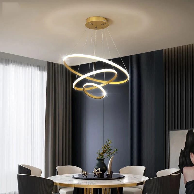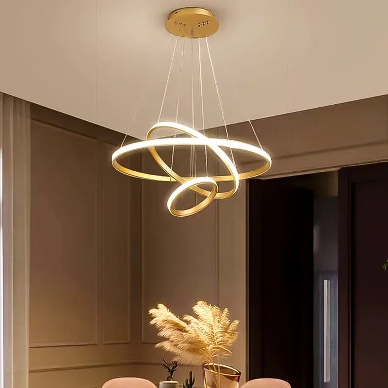 The Modern Luxury Italian Style Three Rings Chandelier features adjustable gold-finished rings with built-in LED lighting and three color modes. Perfect for living rooms, dining spaces, lobbies, and offices, it adds a contemporary statement of elegance.
