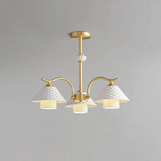 Stylish 790 mm chandelier with metal and ceramic body, brass and white finish, and 4 W warm white LED bulbs. Ideal for living rooms, bedrooms, and study areas.