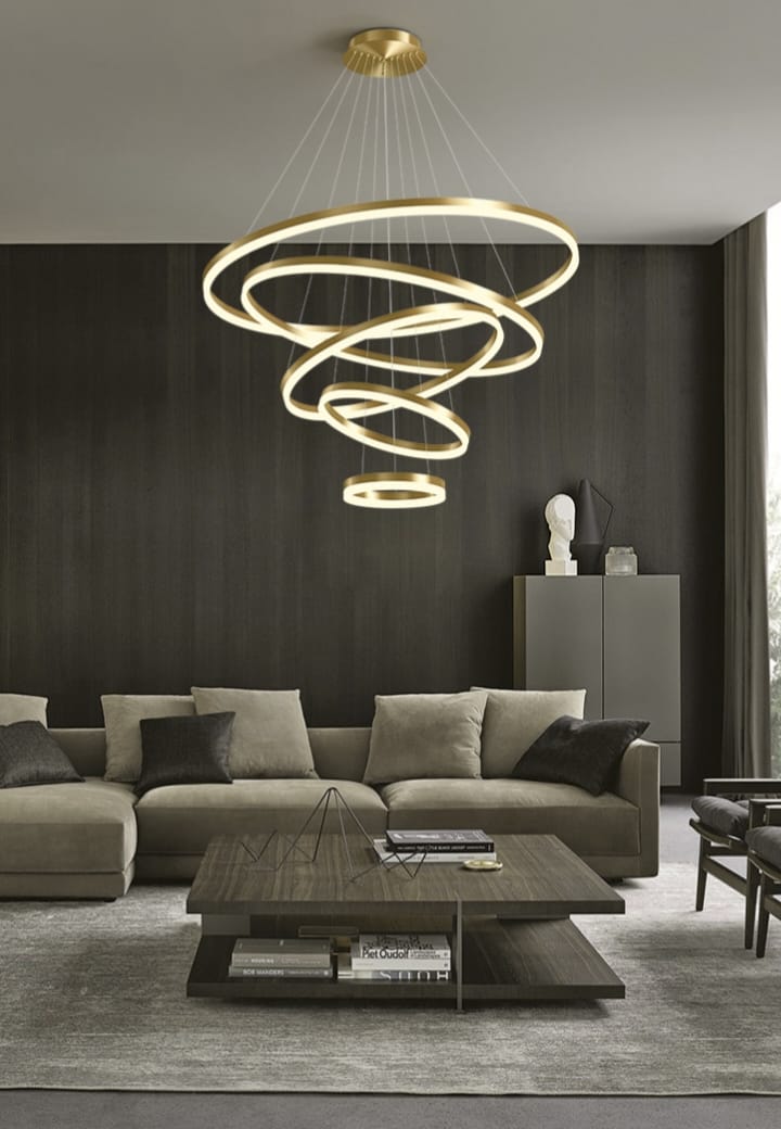 Modern five-deck chandelier with aluminum body and acrylic shades, 16W LED strip, and three adjustable color temperatures. Ideal for living rooms, bedrooms, offices, and double-height lobbies.