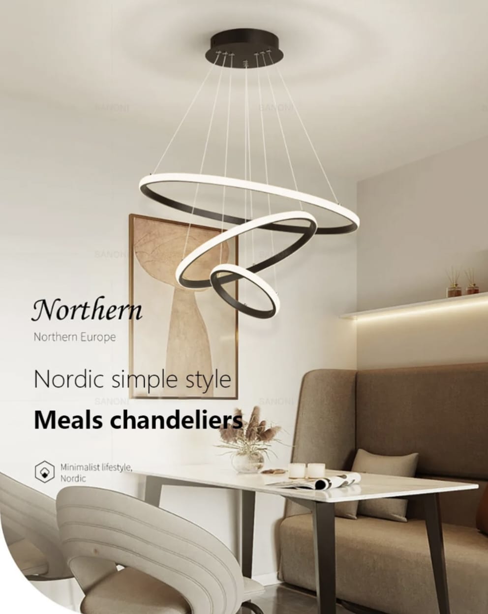 The Modern Luxury Italian Style Three Rings Chandelier features adjustable rings, sleek black finish, and switchable LED lighting modes. A perfect statement piece for luxury living rooms, dining spaces, and modern interiors.