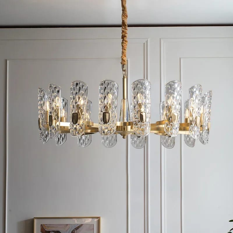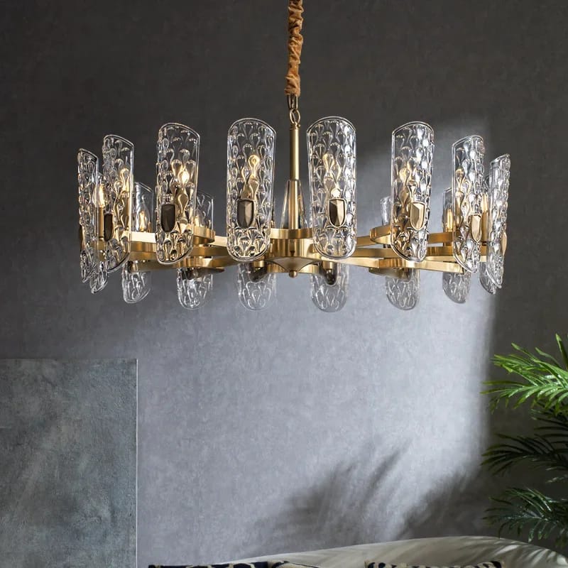 - This elegant chandelier features a sophisticated water-drop inspired glass design, perfectly paired with a brass finish for a luxurious touch. Its warm 3000K glow creates a cozy yet refined ambiance, making it an excellent choice for living rooms, drawing rooms, bedrooms, dining areas, and kitchen tabletops.