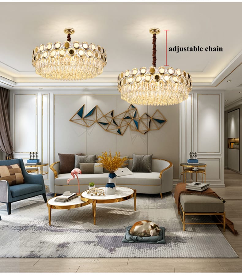 Elegant 800 mm chandelier with metal body, clear crystals, and gold finish ring. Features 4 W warm white LED bulbs and adjustable height, ideal for living rooms, bedrooms, and study areas.