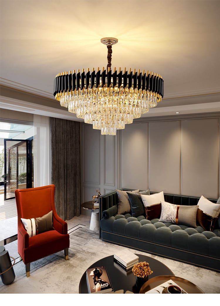 The Post Modern Luxury Black & Gold Crystal Chandelier combines a sleek black finish with golden accents and sparkling crystals for a refined modern look. With its adjustable height and warm 3000K glow, it’s a perfect choice for living rooms, bedrooms, dining areas, and more.