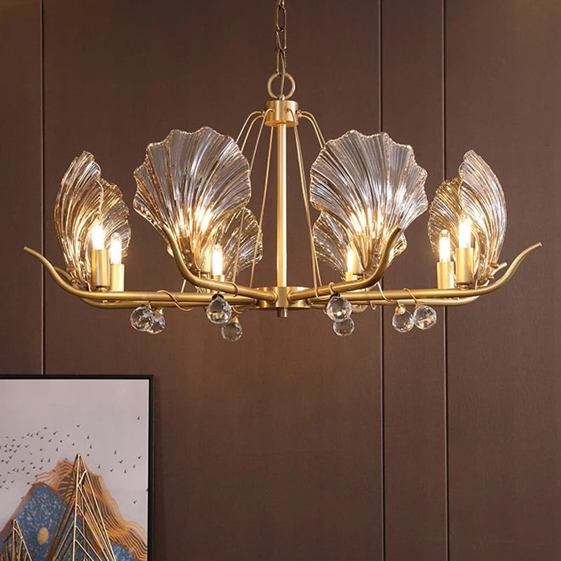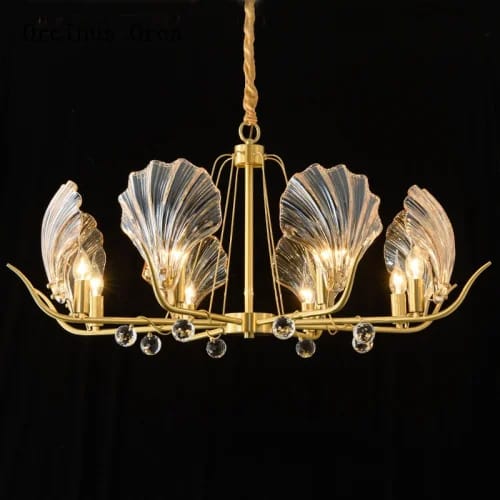 - This chandelier showcases a stunning shell-inspired glass design paired with an elegant electroplated brass finish, blending modern artistry with luxurious detail. Emitting a warm 3000K glow, it creates a cozy yet upscale ambiance, perfect for living rooms, drawing rooms, bedrooms, dining rooms, and kitchen tabletops.