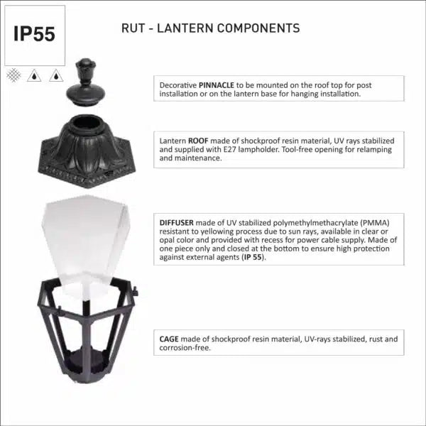 - The Basso/Rut Hexagonal Wall Light is a classic-style, medium-sized outdoor fixture crafted from shock-proof, UV-stabilized resin material. Designed for durability, it is rust-proof, corrosion-free, and weather-resistant, making it ideal for long-term outdoor use.