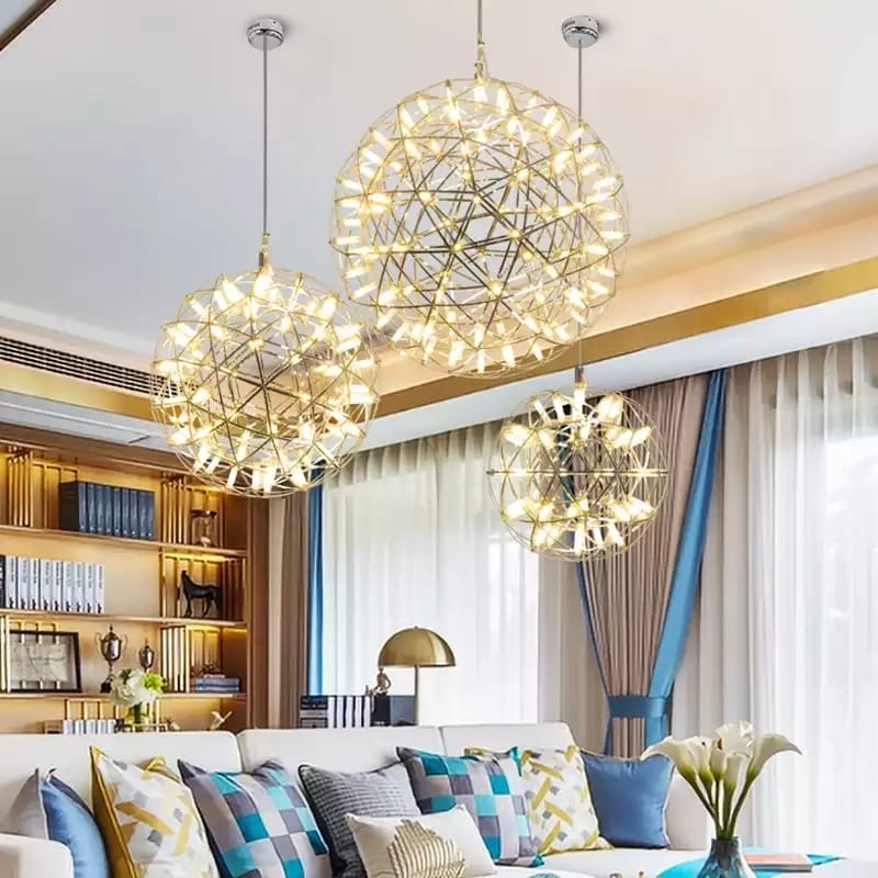 luxury and warmth to your space with the Modern Loft Sparkle Ball Pendant. Crafted from gold-plated stainless steel, it features an elegant electroplated finish and includes LED bulbs for a cozy 3000K glow. Available in multiple sizes, perfect for homes, restaurants, and showrooms.